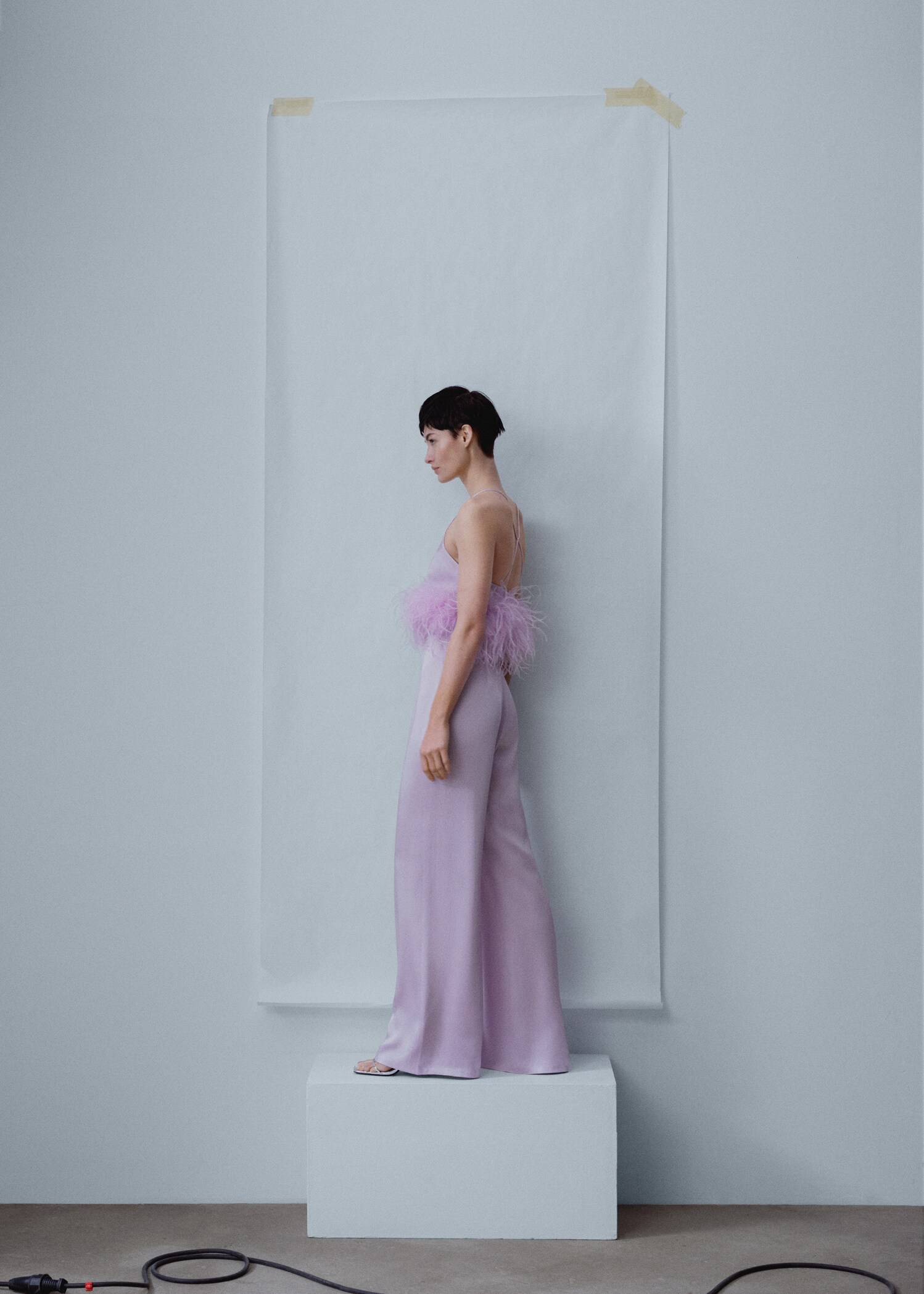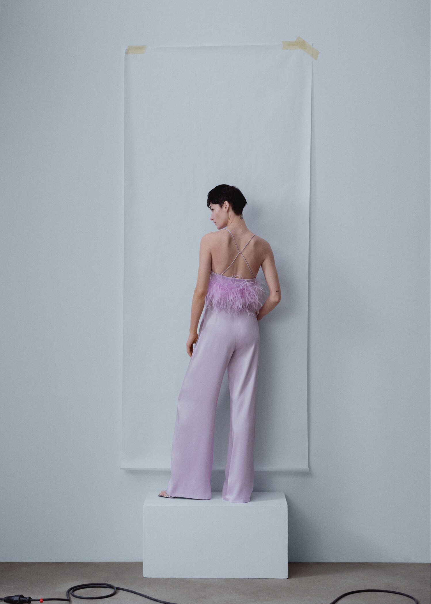 This pastel-toned top with feathers adds sophistication, but at the same time has a fun, rejuvenating and different air. Achieve a striking total look with the matching palazzo trousers. This garment is made in Morocco with Italian fabrics that give the garment quality.. Satin-finish flowy dress. Cropped design. Feather detail. V-neck. Thin straps. Italian fabrics. Made in Morocco. This garment contains a corset zip with a special closure. We recommend steaming the garment as little as possible, since it is distributed ironed. Party and events collection. For purchases made after 06/11/2023, items in the CAPSULE collection can be exchanged or returned within 14 days of the delivery date.