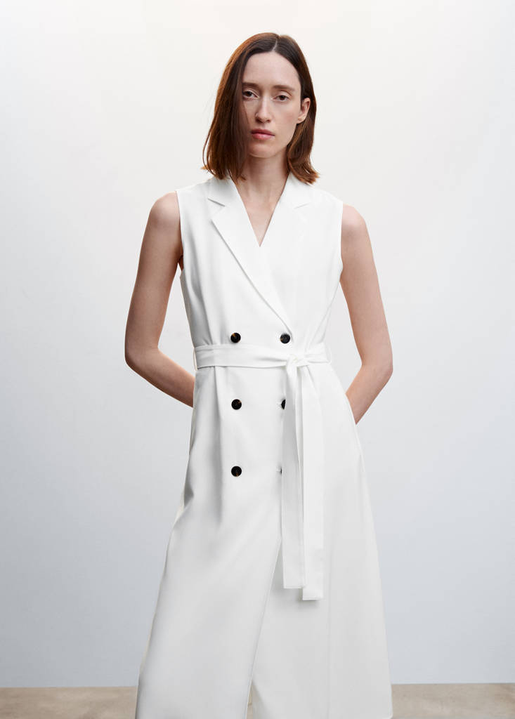 Flowy fabric. Straight design. Midi fit. Lapel-collar V-neck collar. Sleeveless. Inner lining. Double button fastening. Adjustable waist tie. Plus Size Available