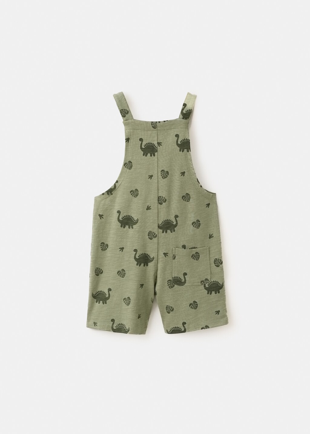 100% cotton fabric. Short design. Straight collar. Straps with button closure. Two front pockets. Dinosaur print. Floral-print design