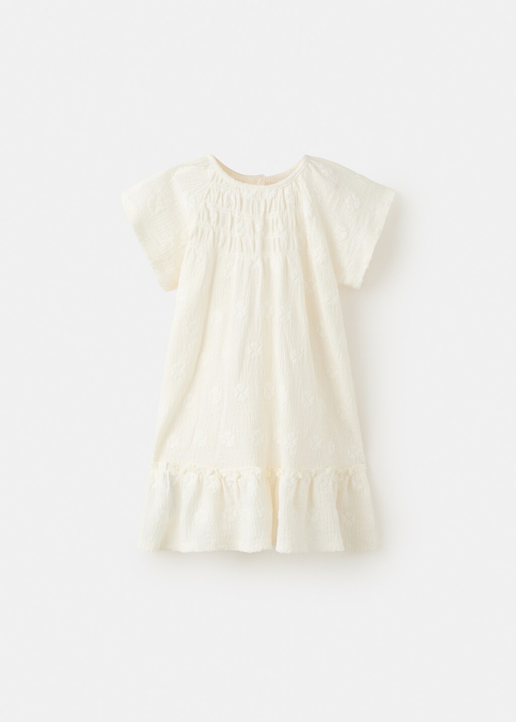 Fluid fabric. Straight design. Short design. Round neck. Short sleeves. Button fastening on the back section. Gathered detail on the chest. Embroidered details