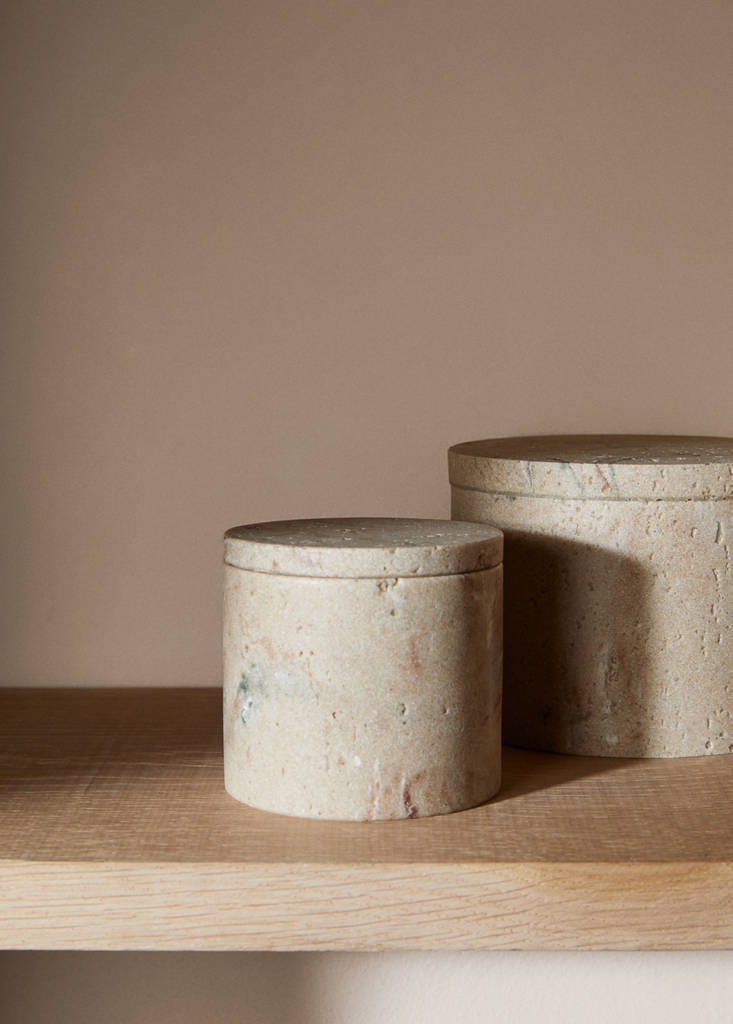 Bathroom decor box. Round shape. With lid. Size: 10x10x9 cm. 100% resin. Marble effect. Made of high-quality resin, it has a polished finish that mimics natural stone, giving it a sophisticated and modern look. Creates a warm and pleasant atmosphere. Available in two sizes. Coordinates with more items from the collection. Size: 10x09cm. Small size. Decorative object. High-quality and durable materials. Create a warm and cozy atmosphere with it