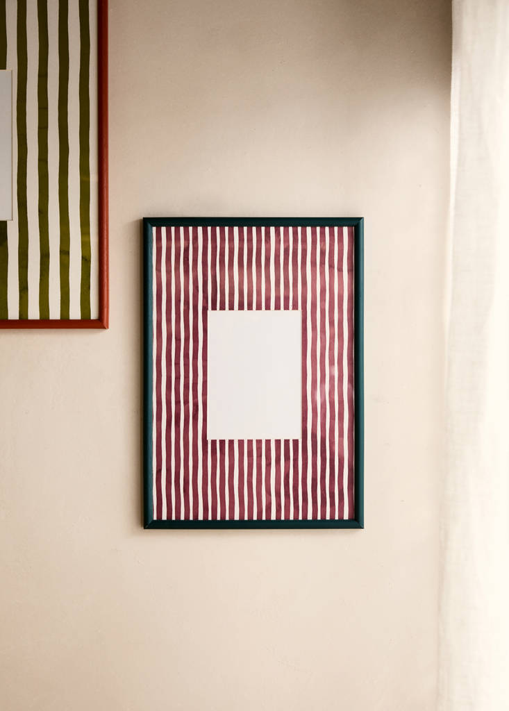 For photos of 13x18 cm. Frame size: 31x44 cm. Two-tone striped background detail. Wood material. Add a colourful and original touch to any space. Archive your photos and memories. Available in different colours