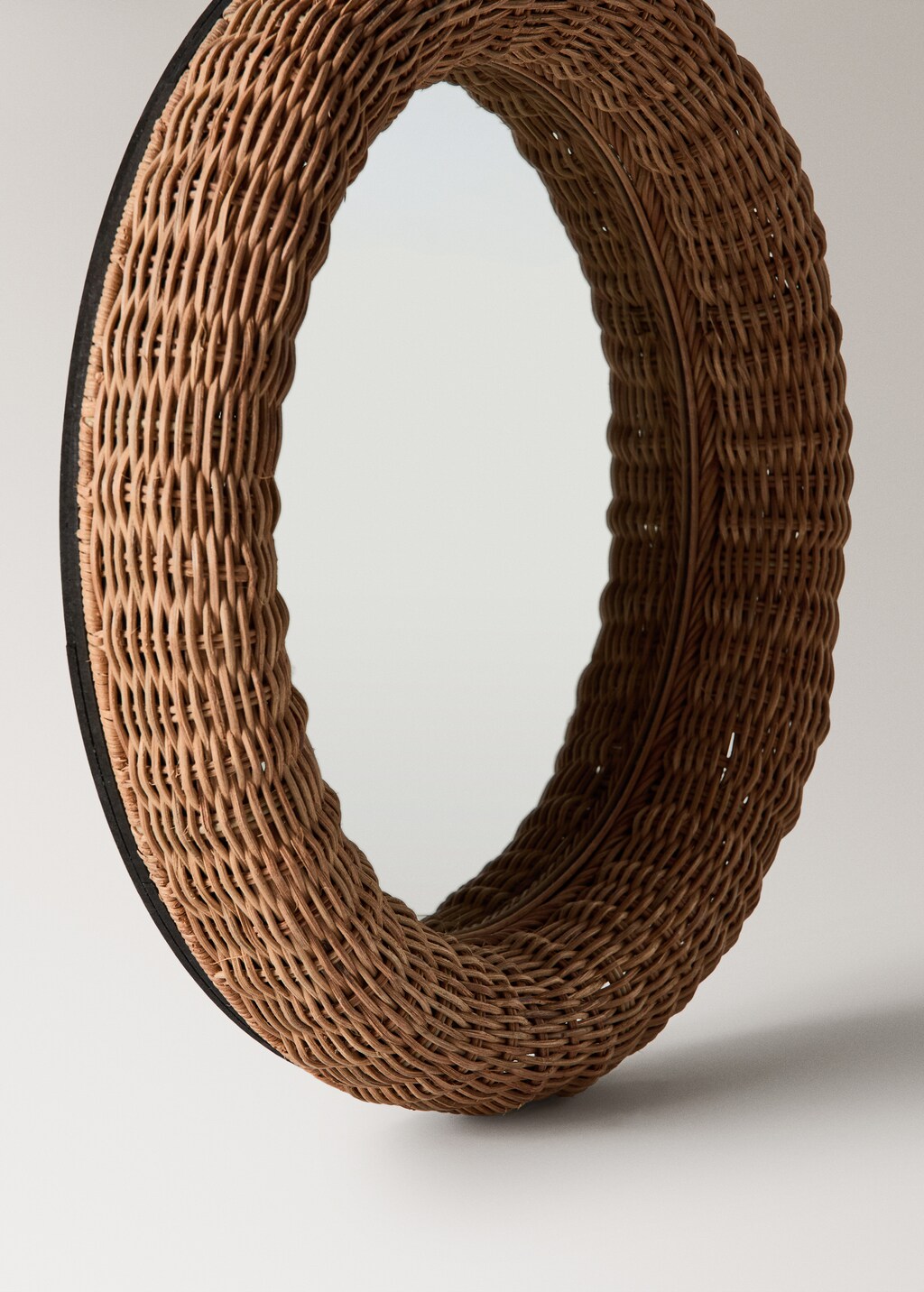 Diameter: 48cm. Height: 6cm. Crafted from rattan and medium-density wood. Medium-sized round mirror with a rustic design, ideal for complementing spaces with a fresh and natural feel. Crafted with a structure that combines metal and rattan, giving it both lightness and durability, as well as a rustic yet elegant finish.