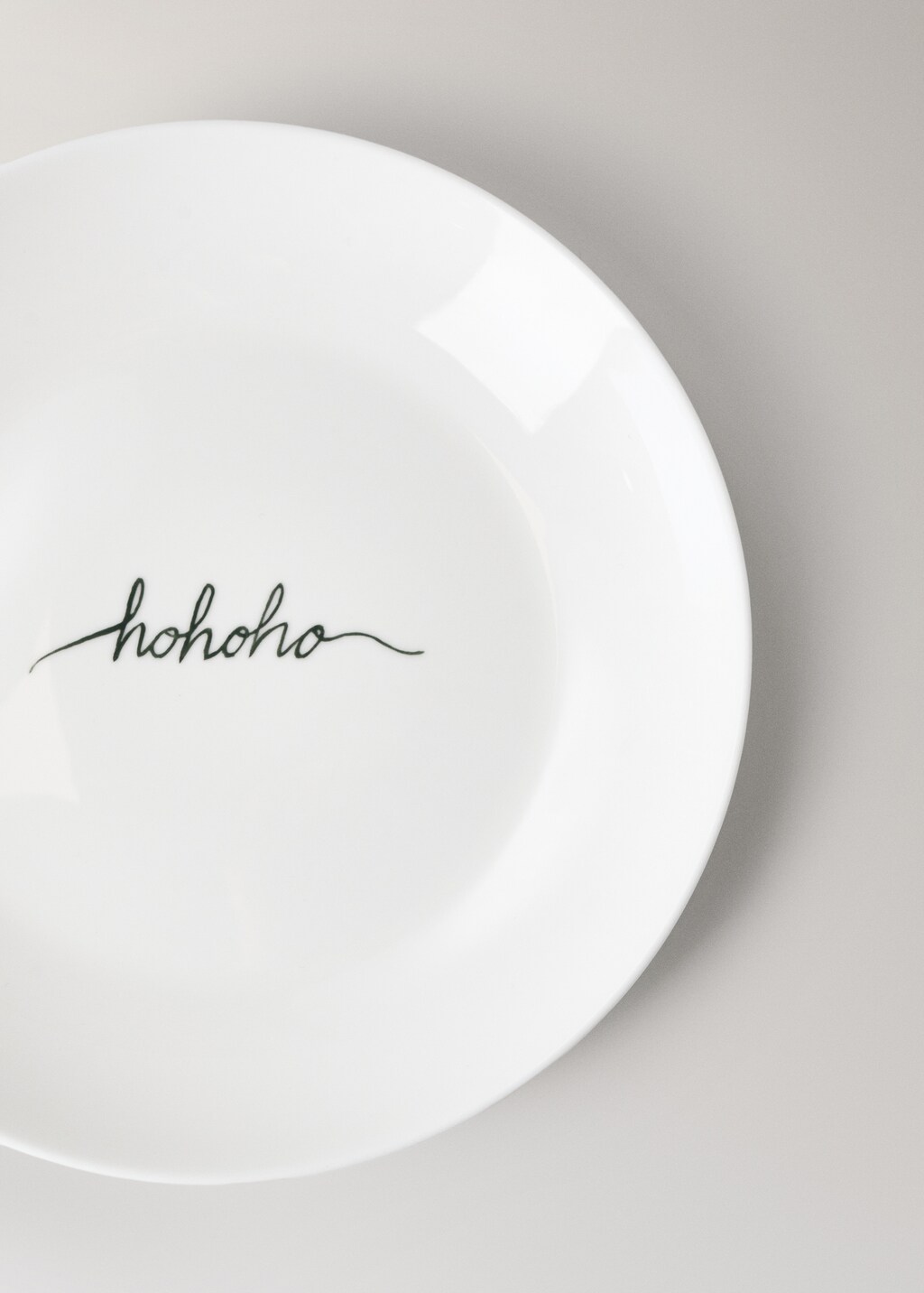 Dessert plate. 100% bone china. Diameter: 21cm. Bonechina dessert plate with a hand-painted Christmas phrase detail, ideal for decorating your table at family gatherings this Christmas. It may contain liquid. Dishwasher safe. Suitable for food. High-quality and durable materials. Christmas Collection.