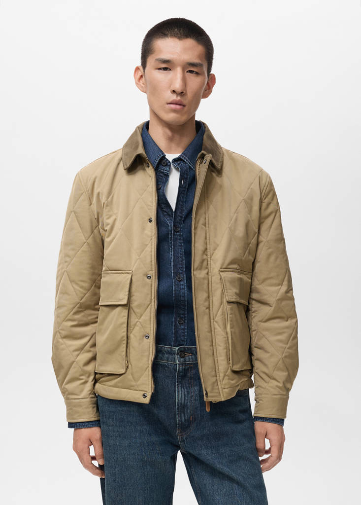 Online Exclusive. Water Repellent: Technical water-repellent fabric. Straight silhouette. Quilted design with diamond structure. Shirt collar. Inner lining. Long sleeves with buttoned cuffs. Two pockets with flaps on the front. Front closure with zip and concealed buttons
