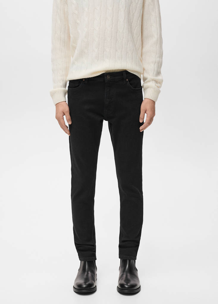 Cotton fabric. Black. Belt loops. Zip and button fastening. Two side pockets. Coin pocket. Two patch pockets at the back. Denim jeans style. Skinny fit: the tightest fitting jeans