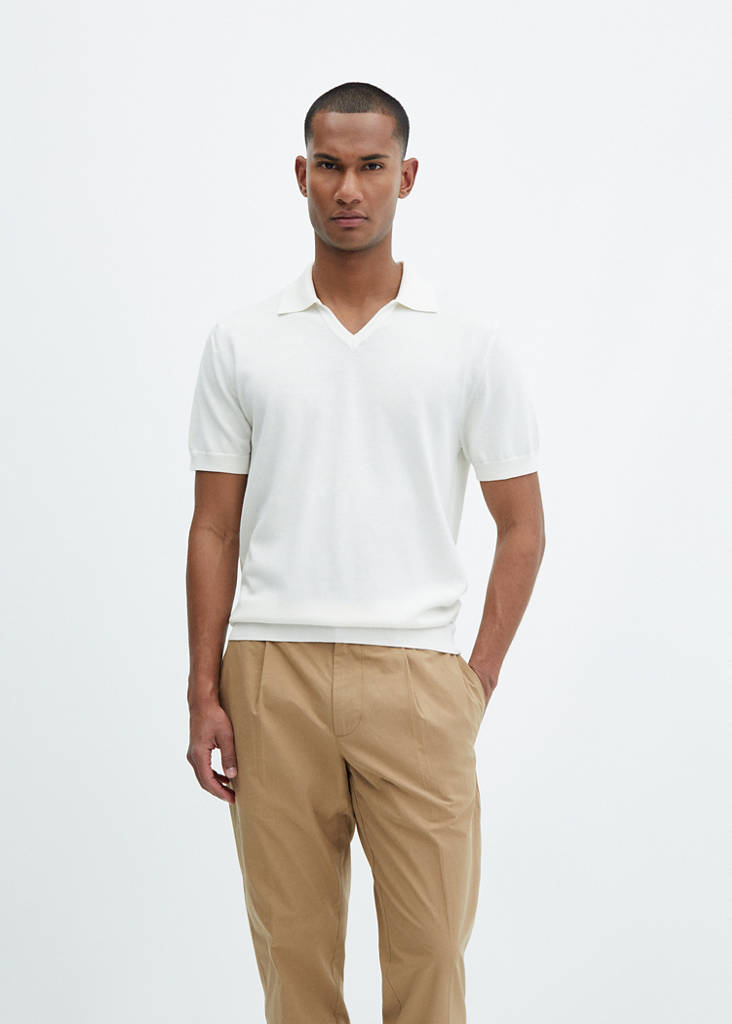 Designed in Italy. Fine knit fabric. V-neck polo collar without closure. Short sleeves. Straight hem. Contrast ribbed finishes on collar, sleeves and bottom hem. 100% cotton fabric