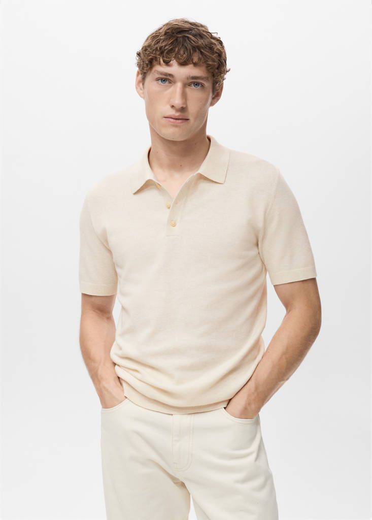 Khaki is an online exclusive. Straight silhouette. Cotton blend fabric. Fine-knit fabric with micro-structure. Polo-neck with button closure. Short sleeves. Untrimmed sleeves. Straight hem. Slim fit. Short sleeves. Ribbed finishes on sleeve and hem. Promotional product