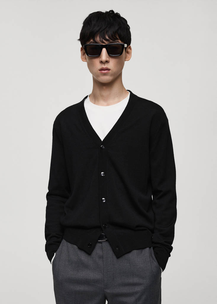 ESSENTIALS: Made to last. Regular fit. 100% wool fabric. Fine knit fabric. V-neck. Button up. Cable knit finish. 100% merino wool. Medium knit fabric. Long sleeves with elastic cuffs. Front closure with buttons. Untrimmed hem