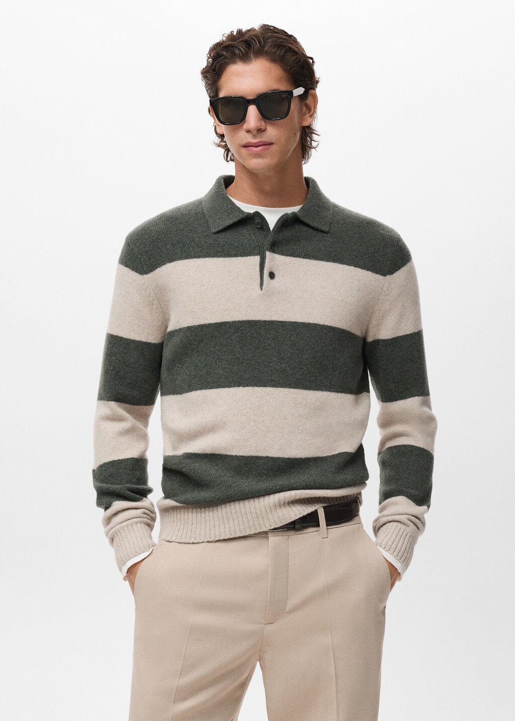 Add to your wishlistNew NowKnitted wool blend polo sweaterCurrent price [£ 59.99 ]£ 59.99Select a colourDark GreenThe model is wearing size M and is 6'1" tall.Select your sizeSMLXLXXLSize guideAddAdd to your wishlistGet the lookFree delivery to storeSee availability in storeDescriptionWool mix fabric. Stripe design. Straight silhouette. Polo-neck with button closure. Ribbed cuffs.See detailsItem qualitiesWoolAt least 40%A natural fibre that creates durable garments and stands out for its capacity to regulate the body temperature.Share
