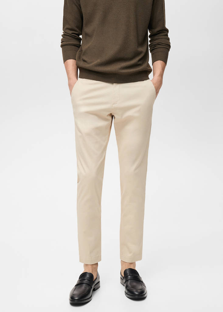 Chinos style. Tapered fit: wide cut at the top that narrows from the knee to the ankle. Cotton fabric. Belt loops. Waist with adjustable inner cord. Zip and button fastening. Soft elastic at front side waistband for added comfort and support the growing bump. Coin pocket at hip height. Two front pockets. Two pockets with buttoned flaps on the back