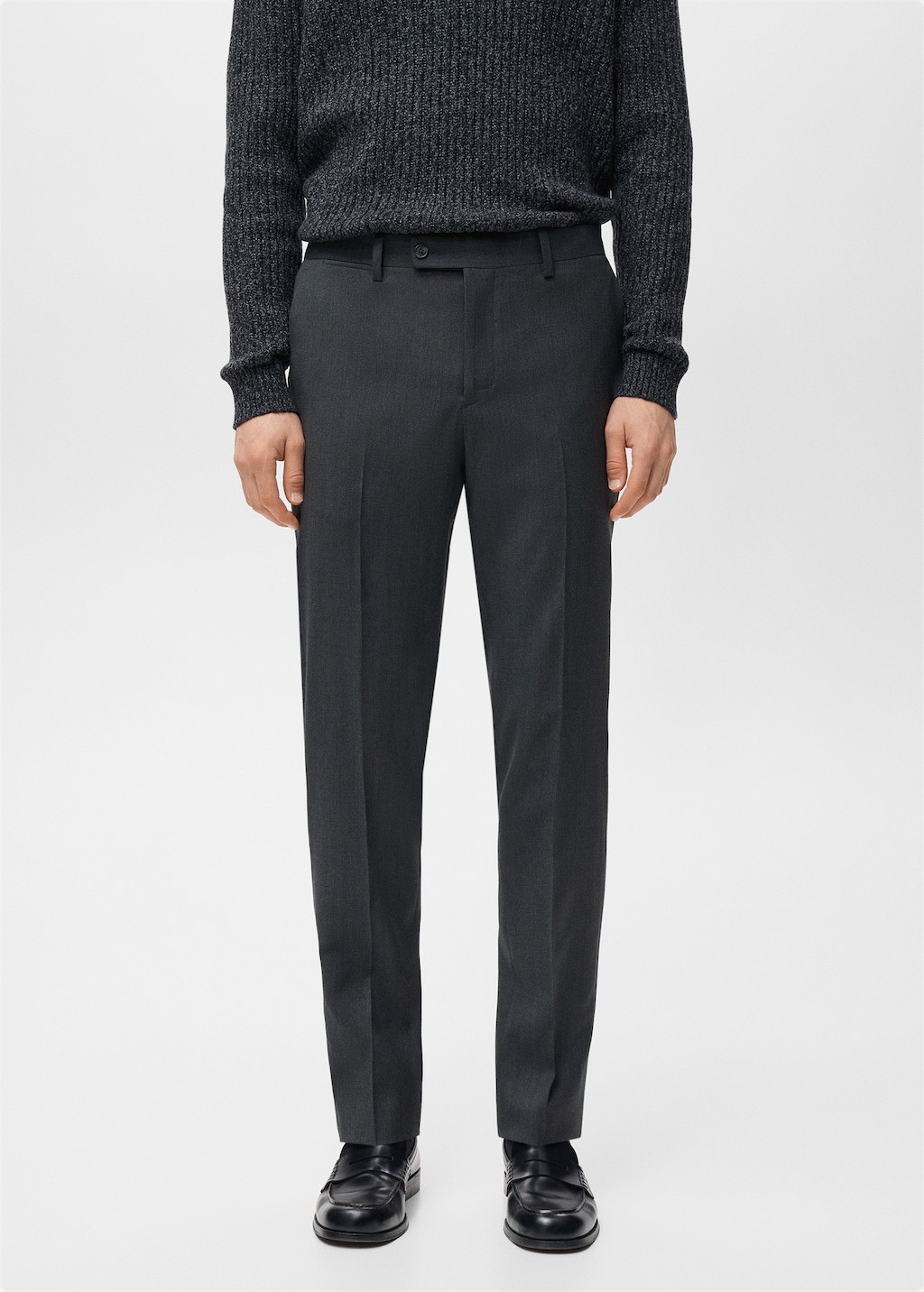 Slim fit. 100% virgin wool. 100% virgin wool fabric. Ironed stripe detail. Two side pockets. Coin pocket. Two welt pockets at the back. Belt loops. Front zip, hook and double button closure.