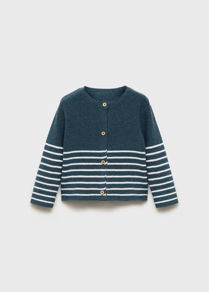 Cotton blend fabric. Knitted fabric. Striped design. Straight design. Round neck. Long sleeves. Front closure with buttons. Contrasting buttons