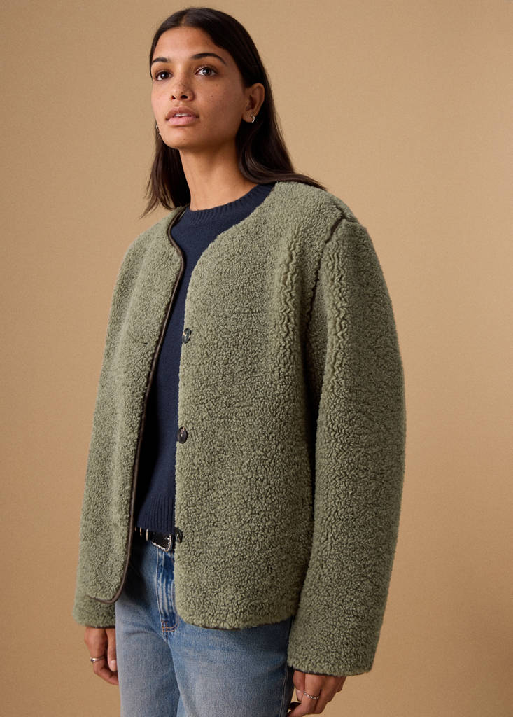 Sherpa fabric. Straight design. Round neck. Long sleeves. Contrasting seams. Front closure with buttons. Two side pockets