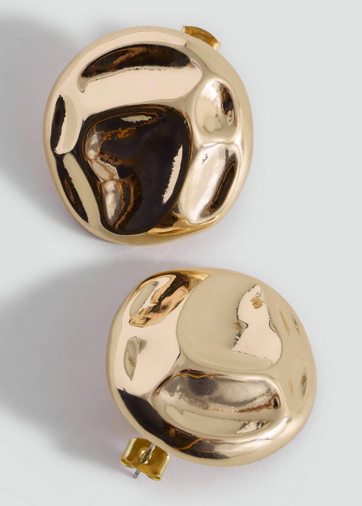 Textured coin earringsCurrent price [£ 9.99 ]£ 9.99Select a colourGoldSelect your sizeOne sizeNot available. I want it!Notify meAdd to WishlistSee lookFree delivery to storeRound design. Textured. Press stud fasteningDetails, composition and careStore availabilityMango StylistAsk about deliveries, returns and moreAssistant