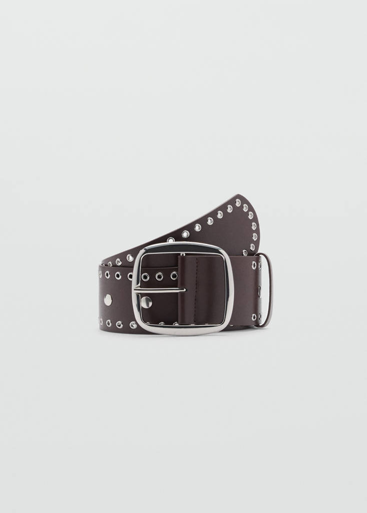 Wide design. Buckle closure. Metallic buckle. Decorative studs