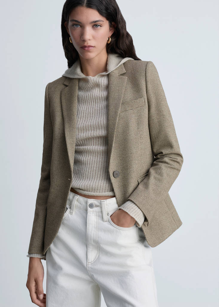 Micro houndstooth print. Fitted design. Lapel-collar V-neck collar. Long buttoned sleeves. Two front welt and flap pockets. Welt pocket on the back. Front button closure. Back slit detail. Inner lining