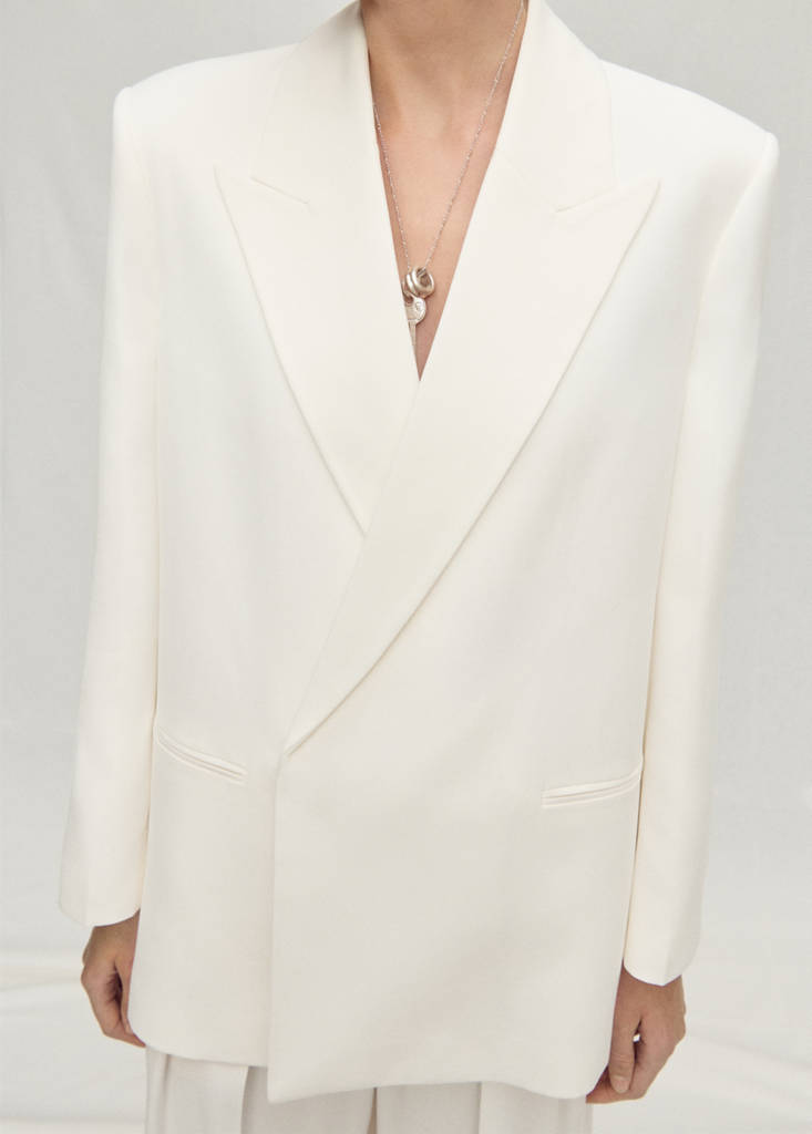 Lyocell-blend fabric. Suit style. Straight design. Lapel-collar V-neck collar. Long sleeves. Two side welt pockets. Hidden button closure. Total look. Selection Collection