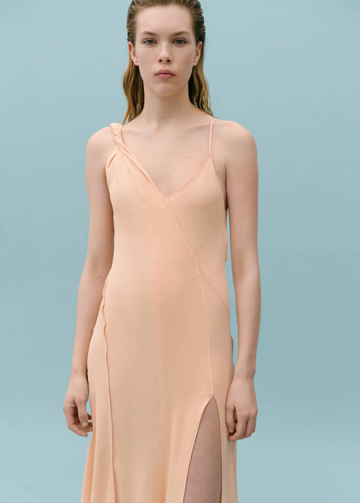 Fluid fabric. Long design. Straight design. V-neckline. Asymmetric neckline. Sleeveless. Straps. No Fastening. Decorative seams. Asymmetric hem. Inner lining. Side slit at the hem
