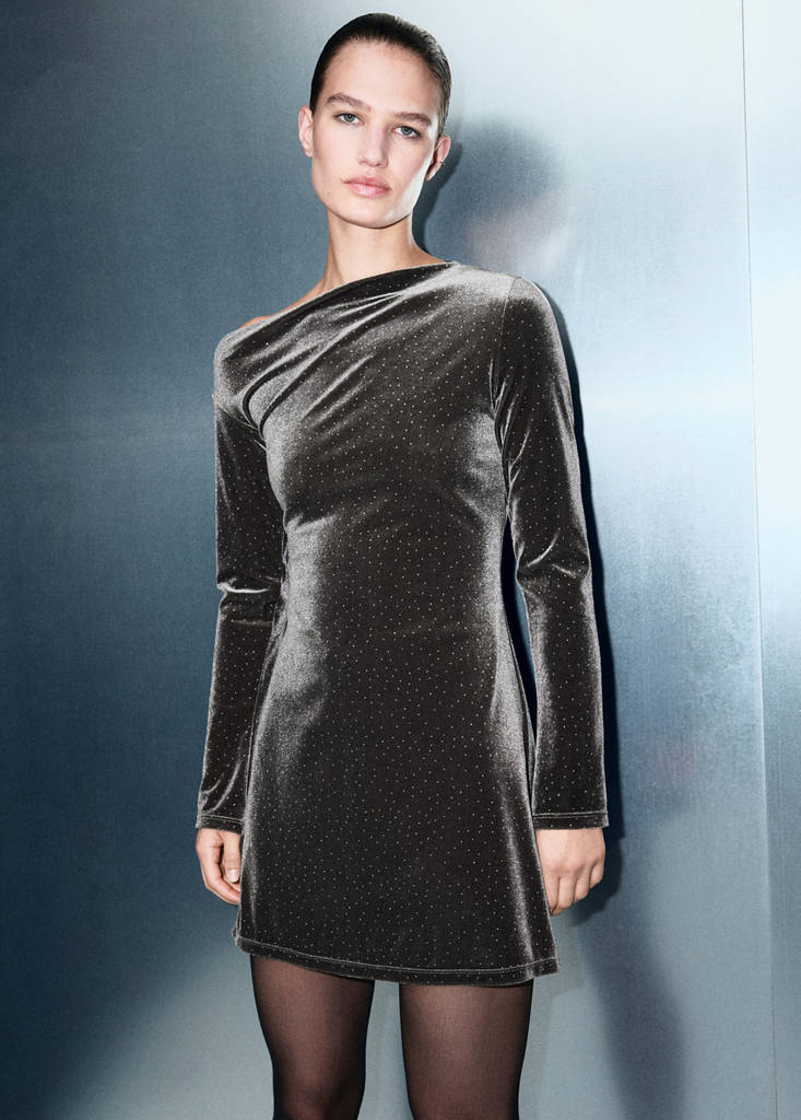 Velvet fabric. Sparkled fabric. Short design. Fitted design. Asymmetrical neckline. Long sleeves. No Fastening. The grey colour is exclusive online. This garment is part of our party and event collection, designed to elevate your looks for special occasions