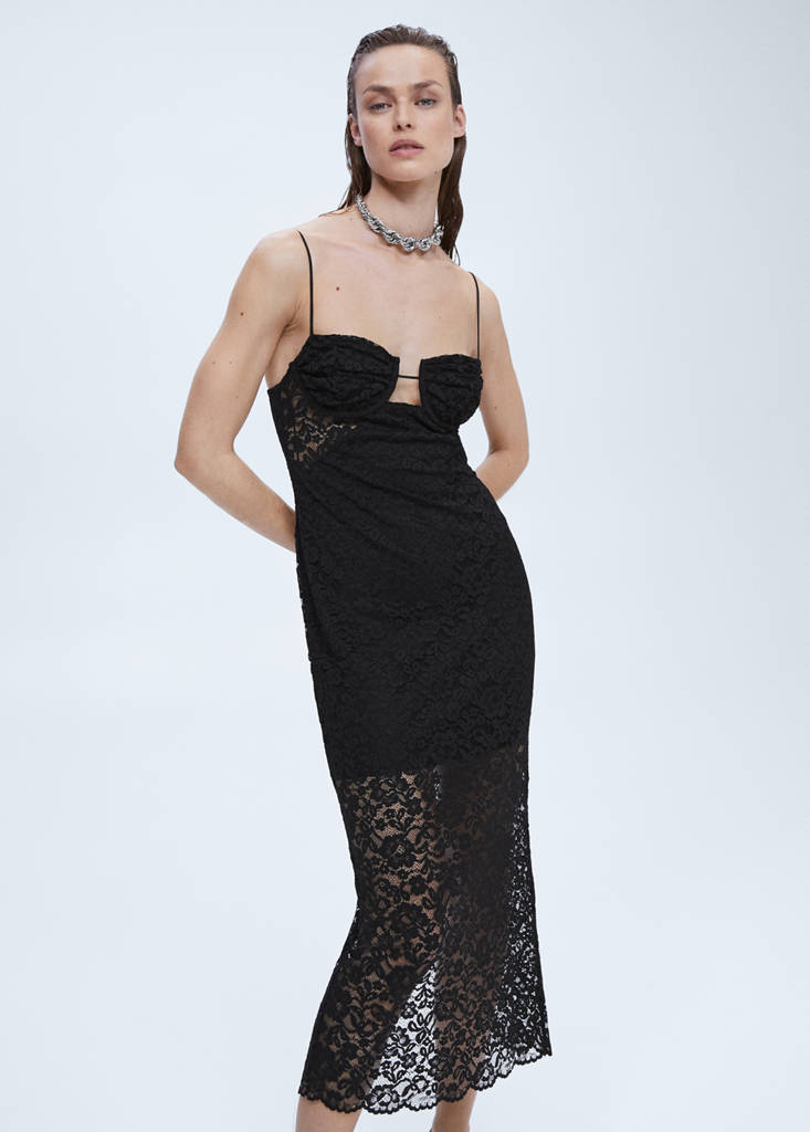 Selection Collection. Lace fabric. Guipure lace. Midi design. Fitted design. Lingerie style. Corset style. Crew neck. Thin straps. Wired. Open back. Invisible back zip fastening. Scalloped hem. Inner lining. Party and events collection