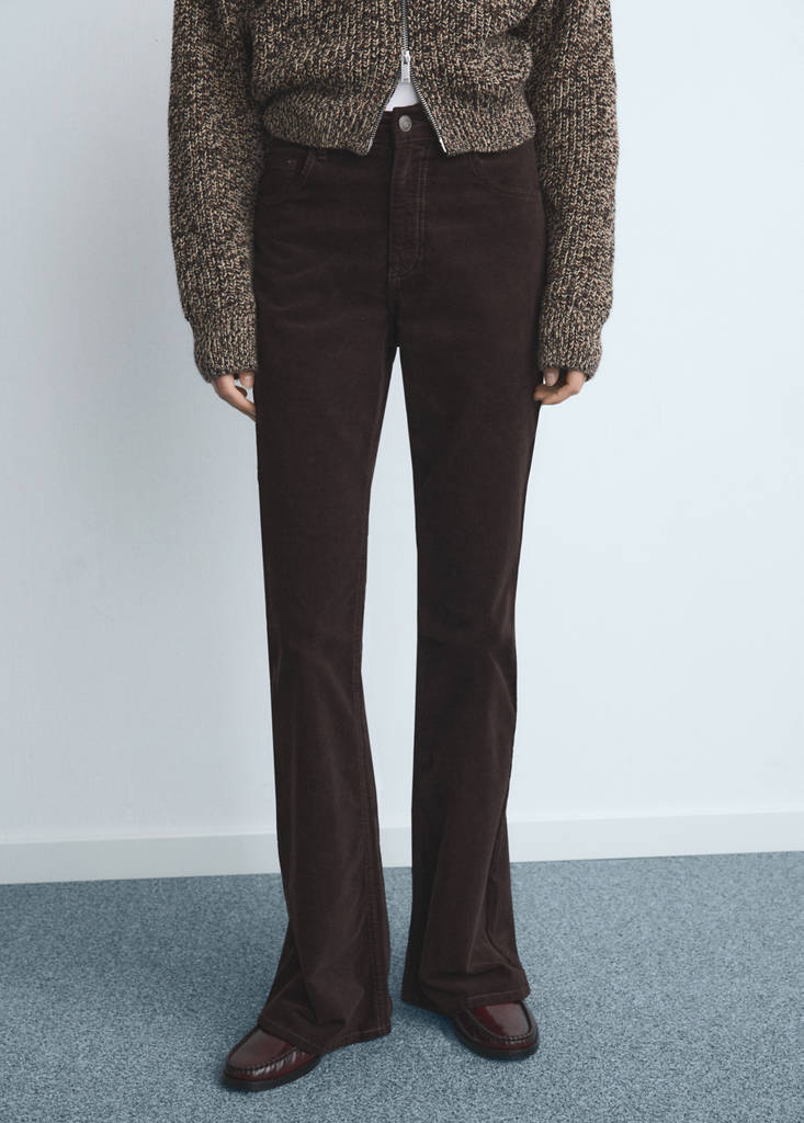 Velvet fabric. Stretch fabric. Long design. Flare design. High waist. Belt loops. Five pockets. Front zipper and button closure. Available Plus. Inside length 84.5 cm