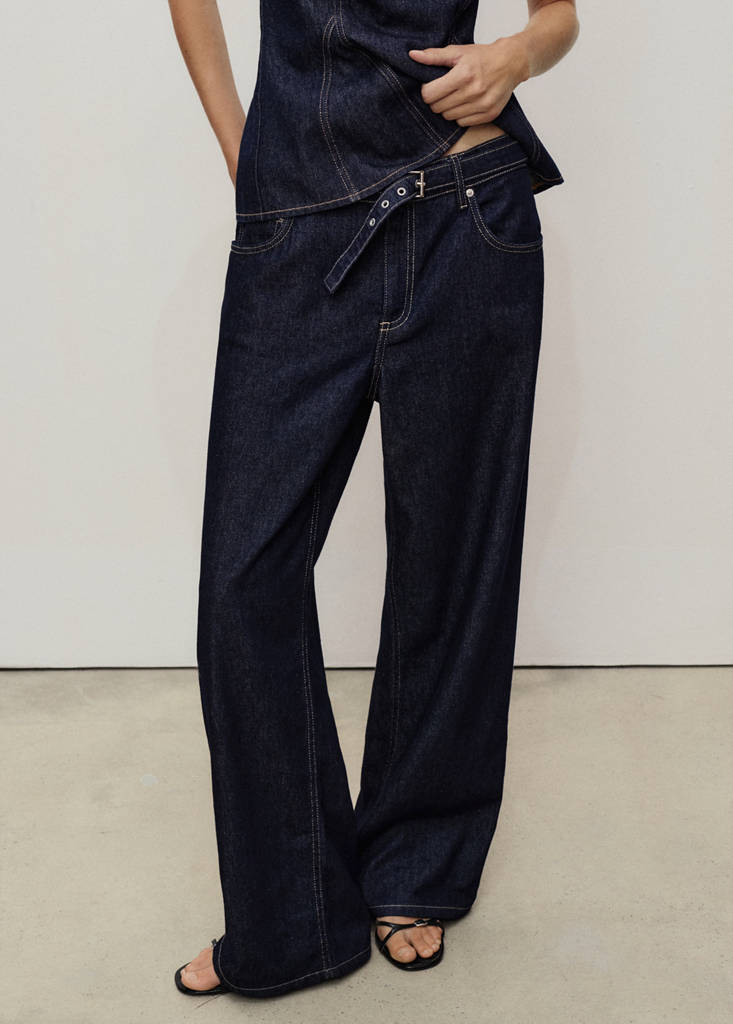 Denim-style cotton fabric. Long design. Straight design. Mid-rise. Belt loops. Adjustable belt. Five pockets. Button and zip fastening. Inside length 79 cm. Total look