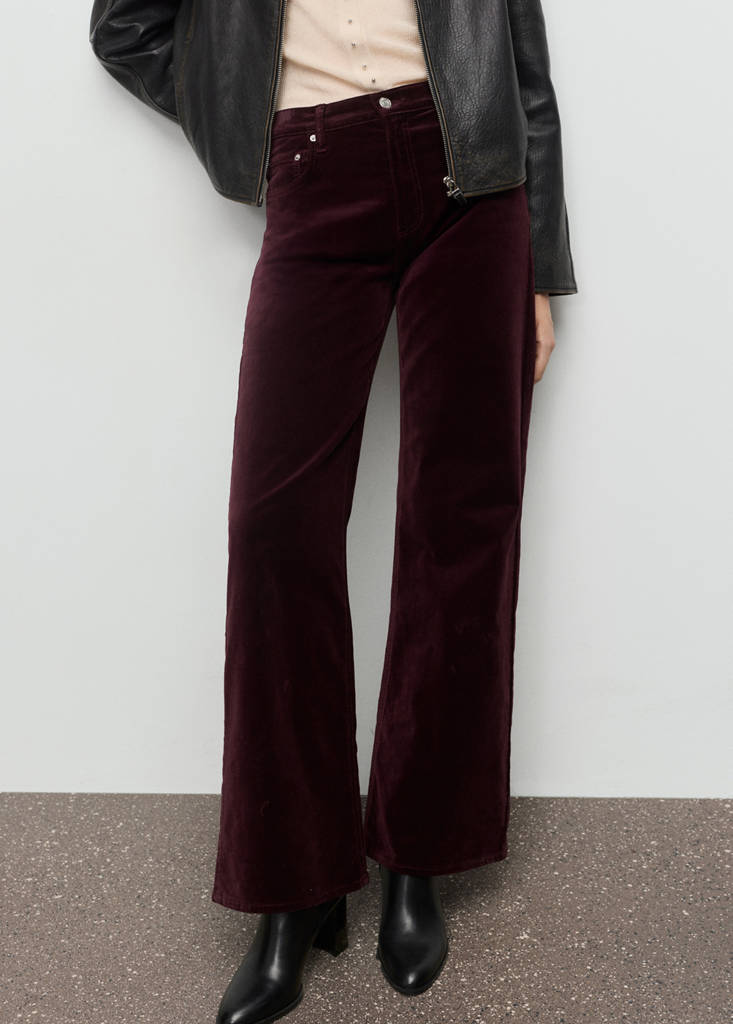 Wide leg velvet jeansCurrent price [£ 79.99 ]£ 79.99Select a colourWineThe model is wearing size 8 (EUR 36) and is 5'10" tall.Select your size4 (EUR 32)Not available. I want it!6 (EUR 34)Not available. I want it!8 (EUR 36)Not available. I want it!10 (EUR 38)Not available. I want it!12 (EUR 40)Not available. I want it!14 (EUR 42)Not available. I want it!16 (EUR 44)Not available. I want it!18 (EUR 46)Not available. I want it!DimensionsNotify meAdd to WishlistSee lookFree delivery to storeVelvet fabric. Long design. Wide-leg design. Mid-rise. Belt loops. Five pockets. Button and zip fastening. Comfort fabric with elasticityDetails, composition and careStore availabilityMango StylistAsk about deliveries, returns and moreAssistant