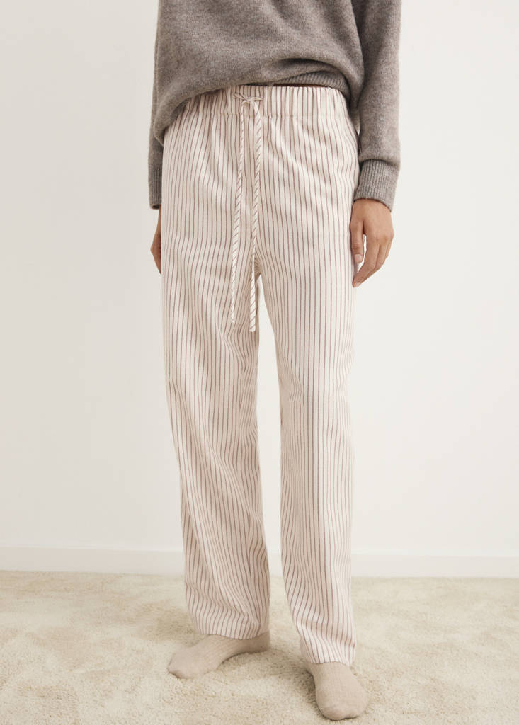 Flannel fabric. Woven stripe. Two-tone design. Adjustable drawstring. Straight design