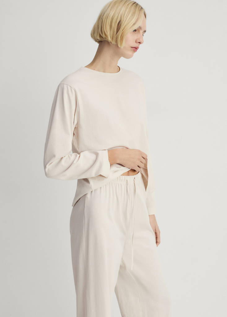 T-shirt and pyjama trousers set. 100% cotton fabric. Round neck. Long design. Straight design. Elasticated waistband. Adjustable tie. Soft and warm fabric that provides comfort at home. Combines comfort and style. This pyjama set features a minimalist and functional aesthetic, crafted from pure cotton that promises comfort and a cosy feel to the touch. Available in two colours