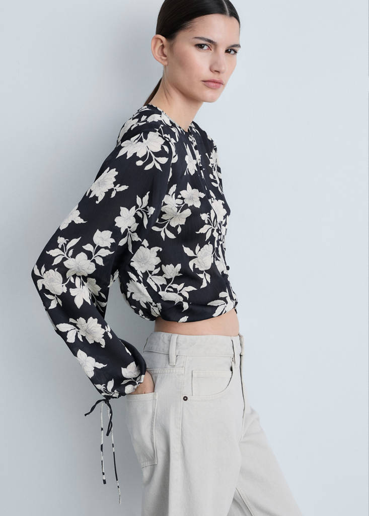 Satin fabric. Straight design. Flowers print. Round neck. Long sleeves with ribbed trims. Button fastening at the front