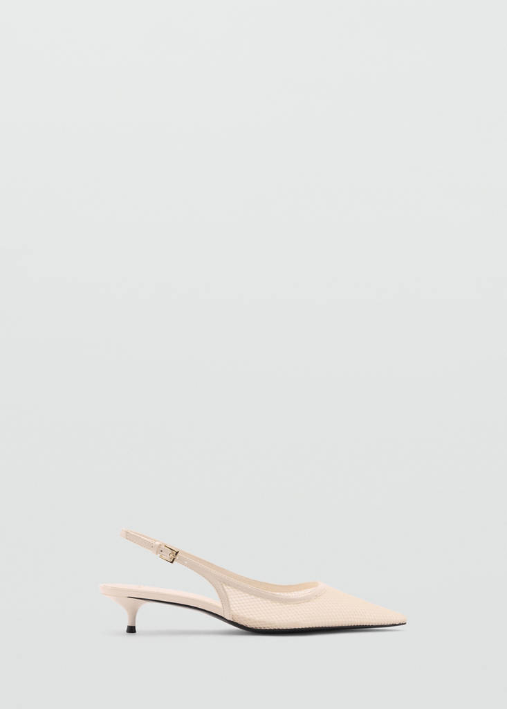 Heeled mesh shoesInitial price struck through [£ 35.99 ]£ 35.99Current price [£ 9.99 ]£ 9.99-72%Select a colourWhiteSelect your size2 (EUR 35)Not available. I want it!3 (EUR 36)Not available. I want it!4 (EUR 37)Not available. I want it!5 (EUR 38)Not available. I want it!6 (EUR 39)Not available. I want it!7 (EUR 40)Not available. I want it!8 (EUR 41)Not available. I want it!9 (EUR 42)Not available. I want it!DimensionsNotify meAdd to WishlistSee lookFree delivery to storeMesh fabric. Slingback design. Pointed. Kitten heel. 3.5 cm heel. Buckle closureDetails, composition and careStore availabilityMango StylistAsk about deliveries, returns and moreAssistant