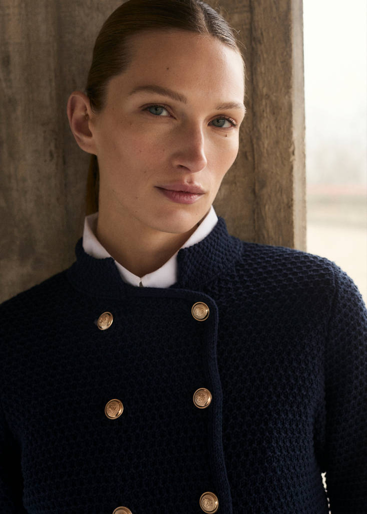 Cotton blend fabric. Midpoint. Straight design. Standard design. Mao neckline. Long sleeves. Double button fastening. Jewel-effect buttons