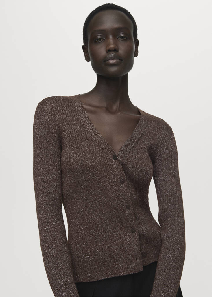 Crafted from fine-knit fabric, this straight design features an elegant ribbed texture. The V-neck and long sleeves add style, while the front button closure ensures comfort
