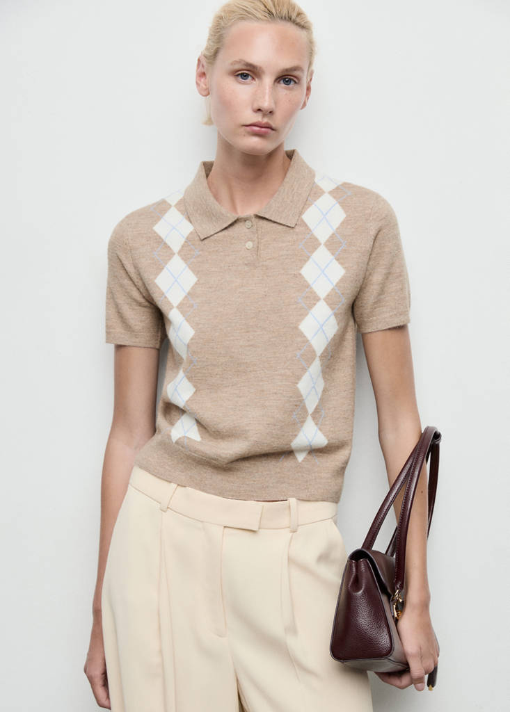 This sweater features a fine-knit fabric with a straight and diamond design. It includes a polo neck with a button fastening and short sleeves. Available in Plus Size