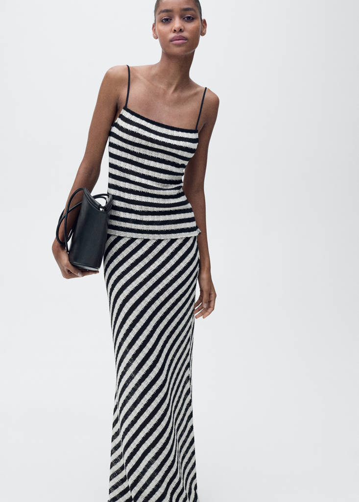 Cotton blend fabric. Knitted fabric. Fitted design. Low neckline. Sleeveless. Thin straps. Open back. Bows closing on the back. Total look
