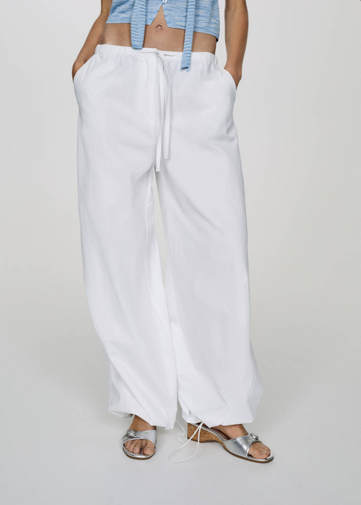 Long design. Parachute. Low waist. Two side pockets. Adjustable waist with inner elastic. Concealed zip and button fastening. Hem with elastic band. Adjustable hem. Festival Season. 100% cotton fabric