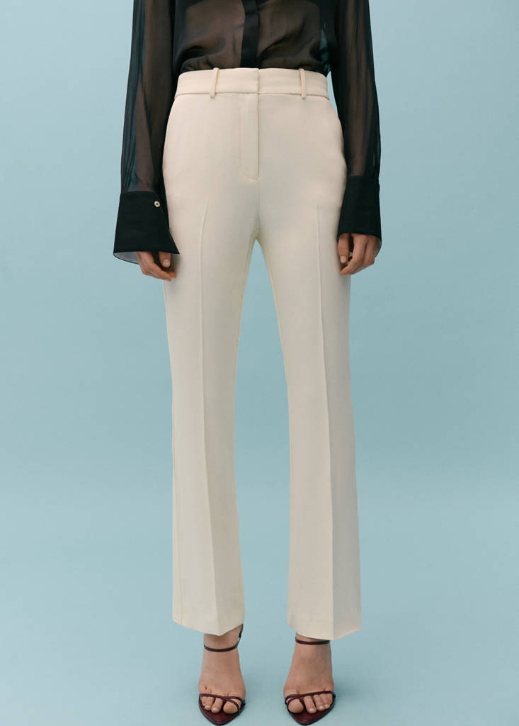 Straight design. Mid-rise. Belt loops. Two side pockets. Two welt pockets at the back. Concealed button, hook and zip fastening. Pleats detail