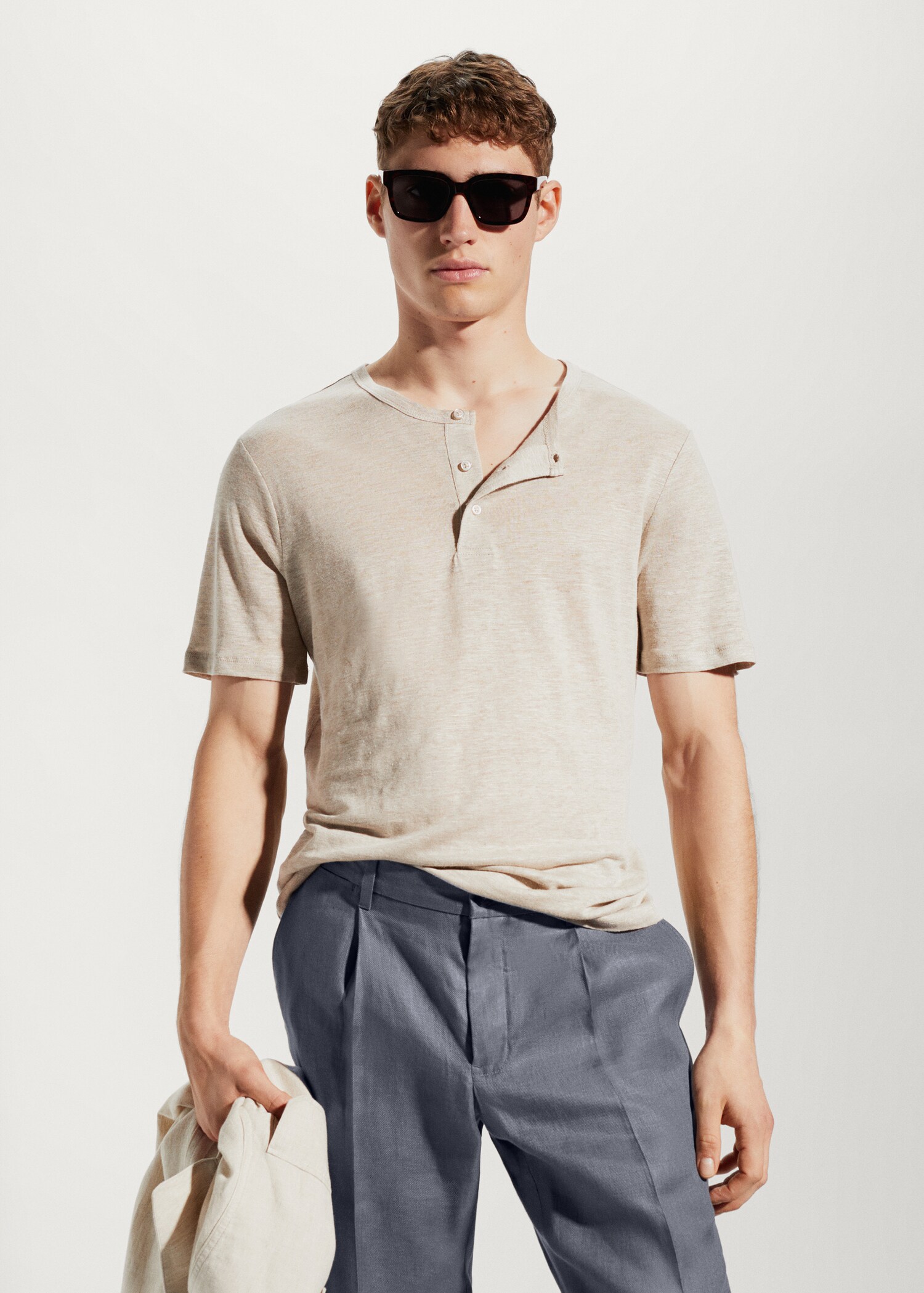 Linen fabric. Slim fit. Light fabric. Henley collar. Rounded neck. Short sleeve. Straight hem. Basics Collection.