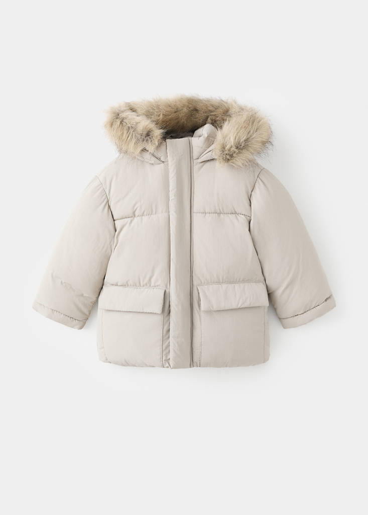 Quilted fabric. Straight design. Round neck. Hood with synthetic hair detail. Long sleeves. Two front flap pockets. Concealed front button fastening