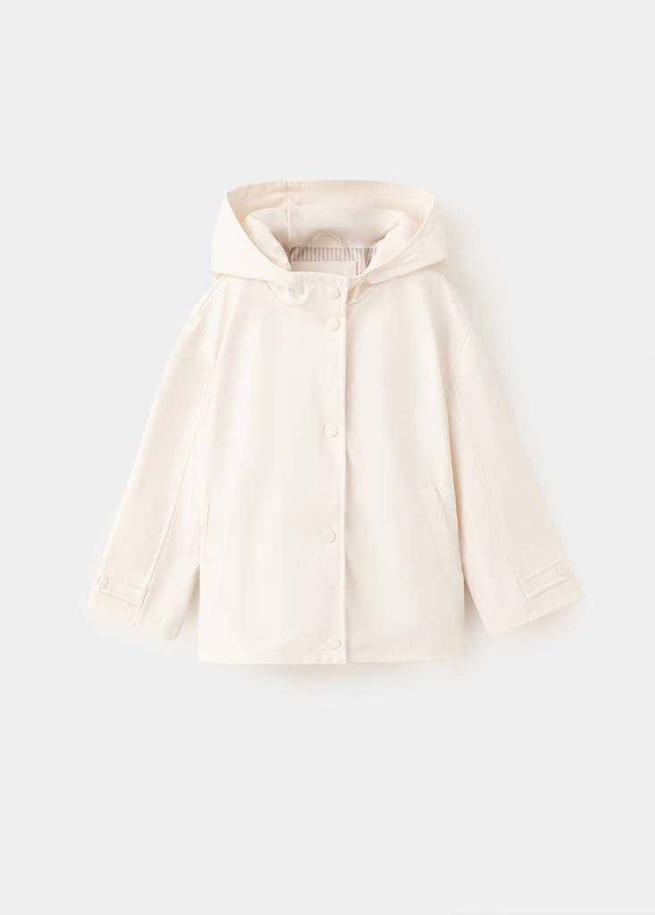 Raincoat. Straight design. Hooded neckline. Long sleeves. Two side pockets. Concealed zip fastening. Inner lining. Button fastening at the front