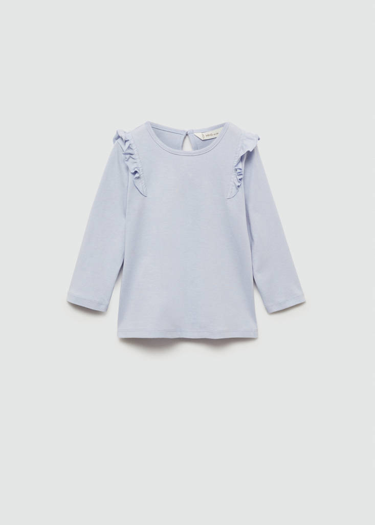 Long -sleeved t-shirt with rufflesCurrent price [GEL 29,00 ]GEL 29,00Select a colourSky BlueSelect your size9-12 months (80cm)12-18 months (86cm)18-24 months (92cm)2-3 years (98cm)3-4 years (104cm)4-5 years (110cm)5-6 years (116cm)DimensionsAdd to WishlistSee lookFree delivery to storeStraight design. Round neck. Long sleeves. Ruffle detail. Teardrop fastening at backDetails, composition and careStore availabilityItem qualitiesRecycled cottonAt least 20%This fibre is obtained from pre- and post-consumer textile waste that is transformed into new fabrics.