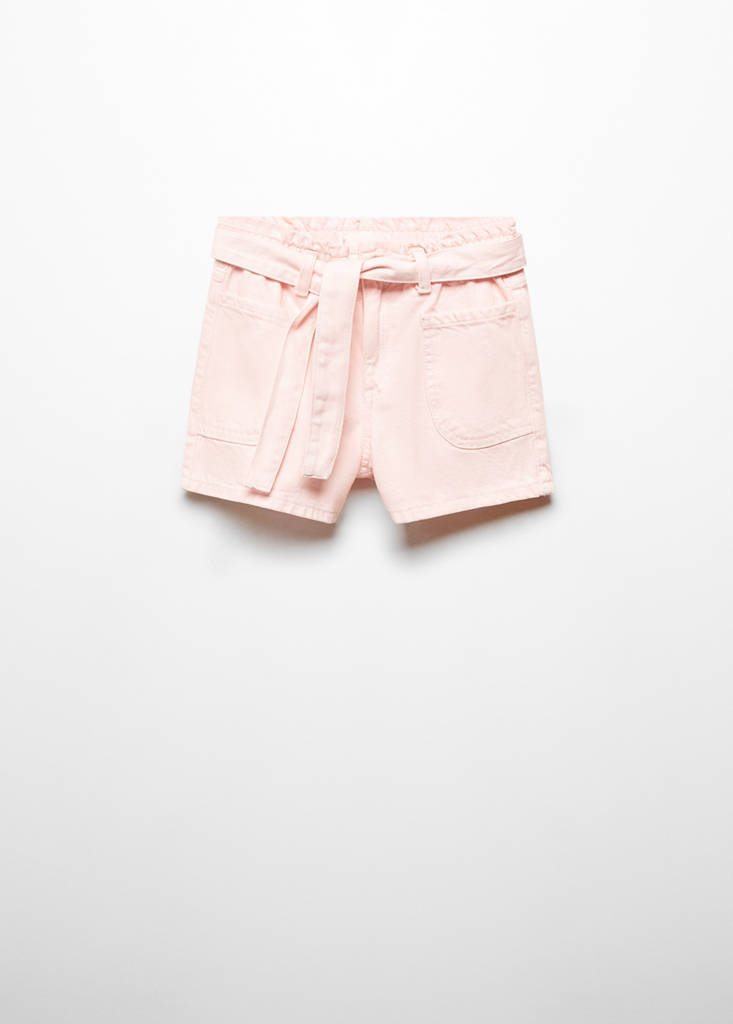 Denim-style cotton fabric. Paperbag. Short design. Adjustable belt. Two front pockets. Two patch pockets at the back. Zip and button fastening. Summer camp