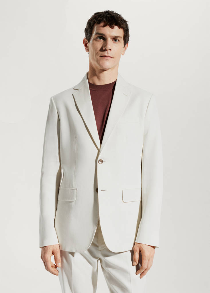 Slim fit. Linen mix. Light fabric. Notched lapel. Front button closure. Welt pocket on the chest. Two pockets with flaps on the front. Long sleeve with buttoned cuffs. Straight hem. Inner lining. Three inside pockets. Tailoring collection. Antoine Griezmann Campaign