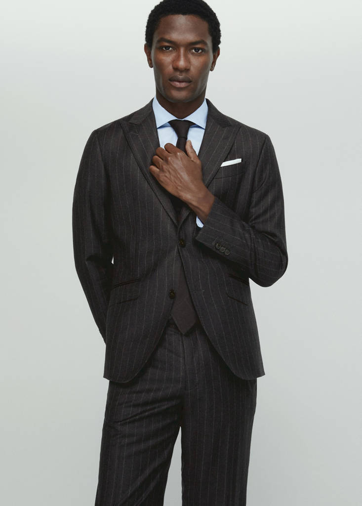 Tailored suit made with high quality Italian fabrics. Made in the best workshops in Portugal. 100% virgin wool fabric. Slim fit. Pinstripe pattern. Wide lapel collar. Chest welt pocket. Two side pockets with flaps. Long sleeves with buttoned cuffs. Double back slit. Inner lining. Interior pocket. Front closure with buttons