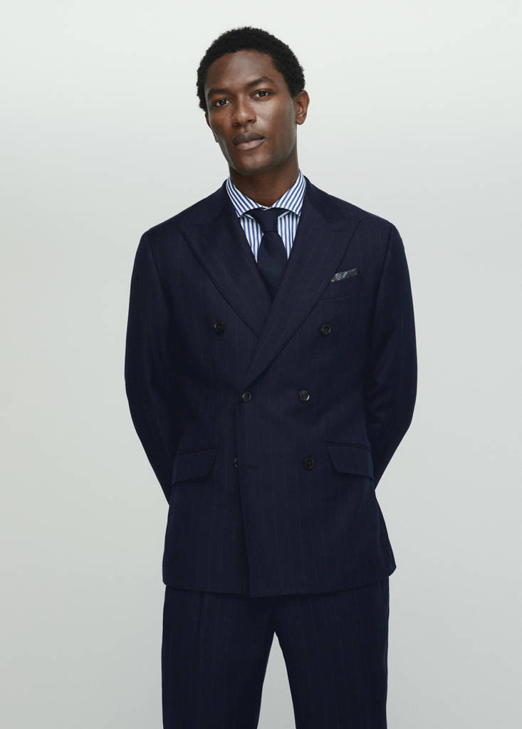 Tailored suit made with high quality Italian fabrics. Made in the best workshops in Portugal. 100% virgin wool fabric. Slim fit. Pinstripe pattern. Wide lapel collar. Front closure with crossed buttons. Chest welt pocket. Two side pockets with flaps. Long sleeves with buttoned cuffs. Double back slit. Inner lining. Interior pocket