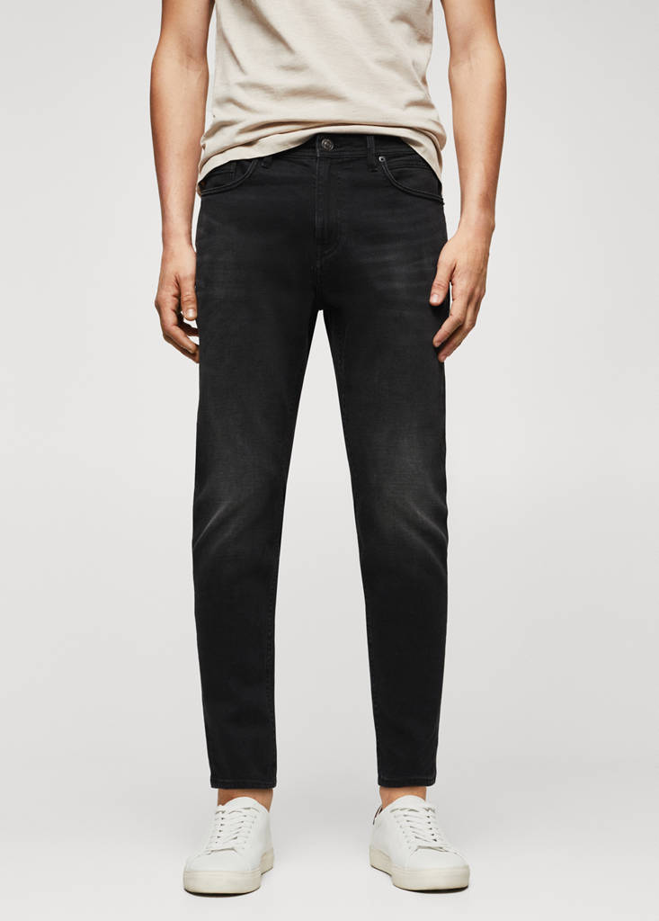 Tapered fit: wide cut at the top that narrows from the knee to the ankle. Denim style cotton fabric. Cotton and lyocell blend fabric. Dark grey wash. Belt loops. Zip and one button fastening. Five pockets. Crop style. The model is wearing a size 42. Denim jeans style