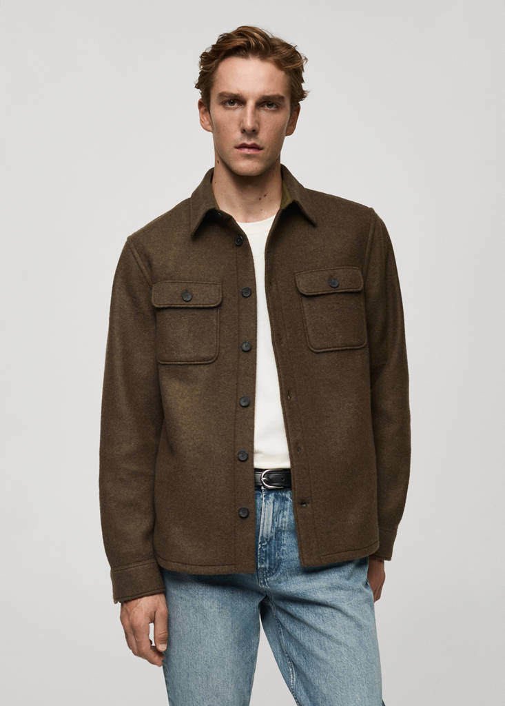 Regular fit. Wool mix fabric. Button closure. Shirt collar. Long sleeves with buttoned cuffs. Two patch pockets with flap and button on the chest. Rounded base