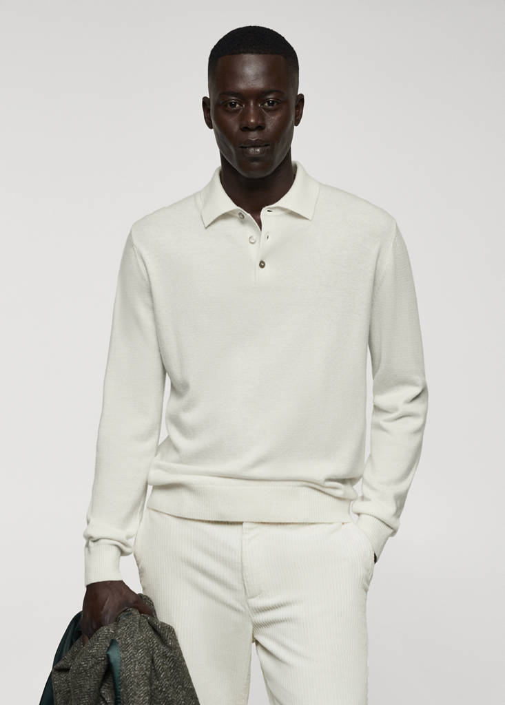 Wool and cashmere-blend fabric. Italian fabric. Polo-neck with button closure. Fine knit fabric. Straight design. Long sleeves with elastic cuffs. Straight hem. Untrimmed hem