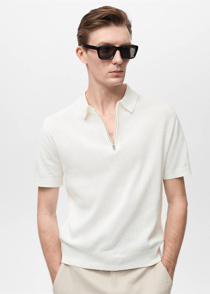 Openwork knitted polo shirt with zipCurrent price [GEL 129,00 ]GEL 129,00Select a colourEcruThe model is wearing size M and is 189cm tall.Select your sizeSMLXLXXLDimensionsAdd to WishlistSee lookFree delivery to store100% cotton fabric. Straight-fit. Fine-knit fabric with openwork details. Polo-neck with zip closure. Contrasting knitted sleeve. Ribbed finish on neck, sleeves and hemDetails, composition and careStore availability